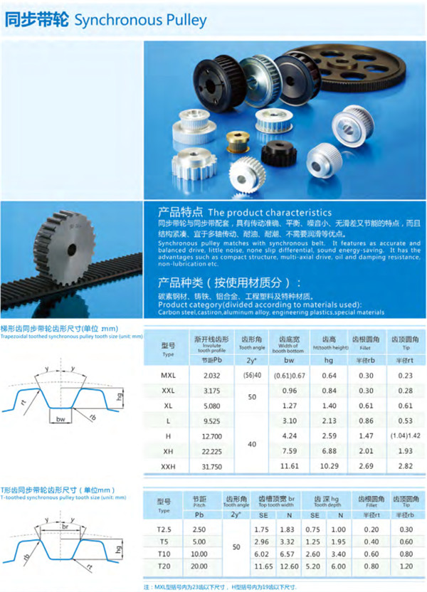 材质选用一般以碳素钢为主,也可按客户要求采用铝合金、铜材、尼龙等材料加工;带轮外径如大于250mm,一般采用铸铁材料。圆弧齿轮传动的特点: 1) 圆弧齿轮传动试点啮合传动,值适用于斜齿轮,不能用于直齿轮。 2) 相对曲率半径比渐开线大,接触强度比渐开线高。 3) 对中心距变动的敏感性比渐开线大。加工时,对切齿深度要求较高,不允许径向变位切削,并严格控制装配误差。